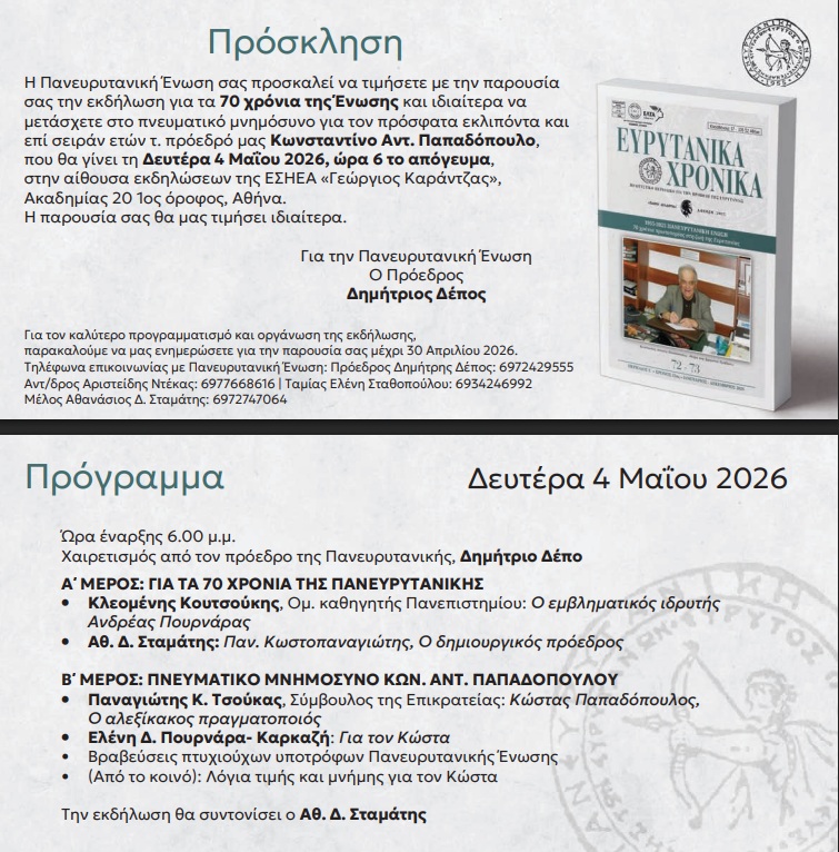 Πρόσκληση της Πανευρυτανικής Ένωσης, σε εκδήλωση για τα 70 χρόνια της Ένωσης και πνευματικό μνημόσυνο Κωνσταντίνου Παπαδόπουλου – την Δευτέρα 4 Μαίου 2026 και ώρα 6 το απόγευμα στην ΕΣΗΕΑ.